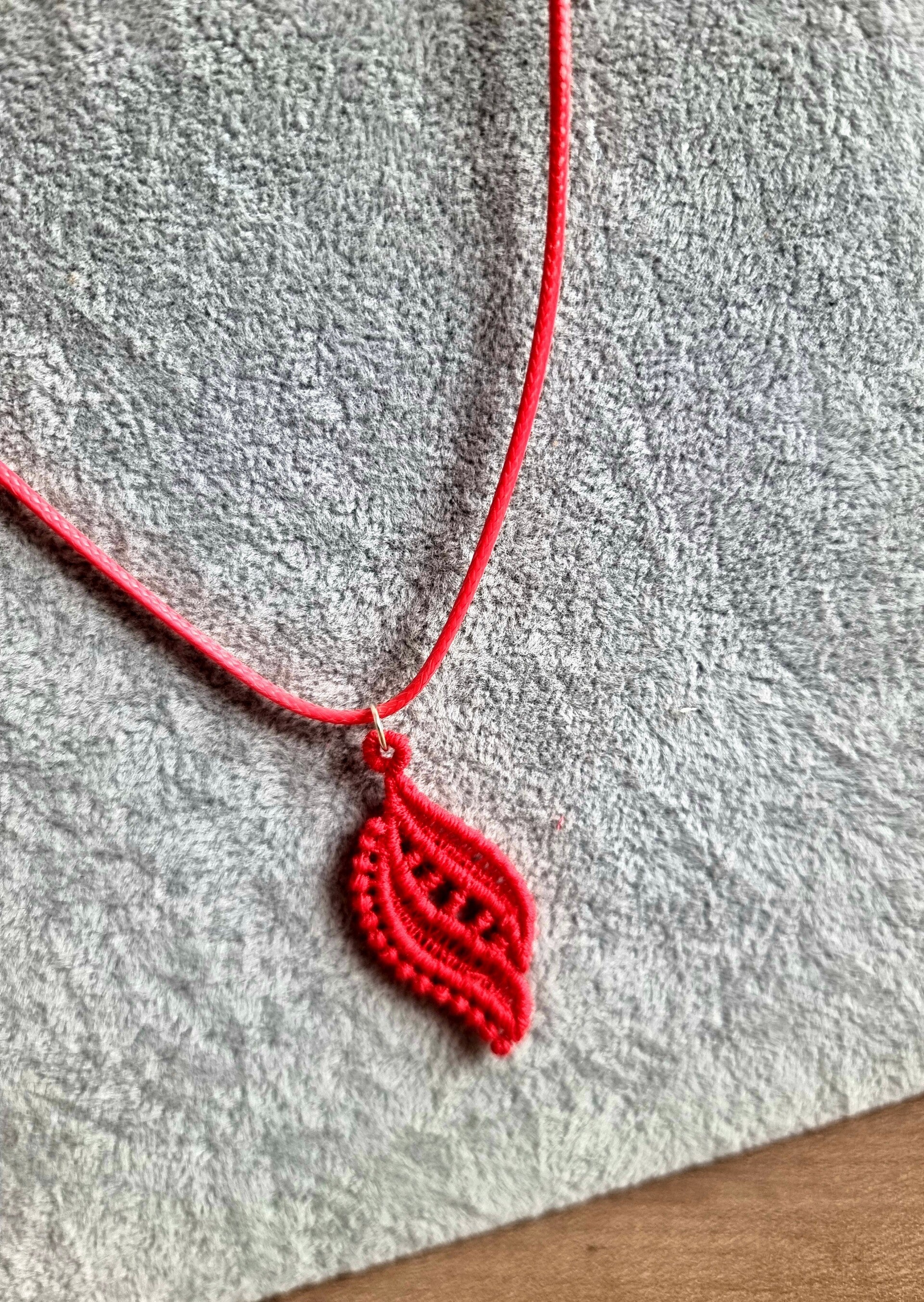 Collier avec pendentif brodé rouge au motif fin et graphique.